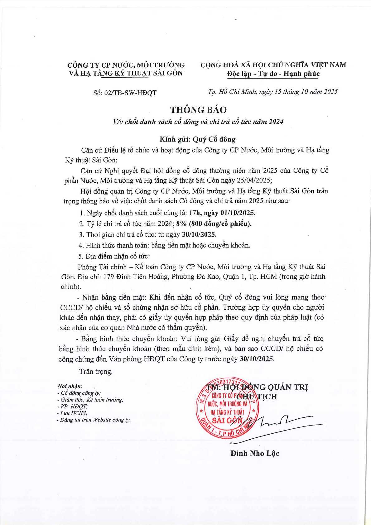 Thông báo về việc Chốt danh sách cổ đông và chi trả cổ tức năm 2024;